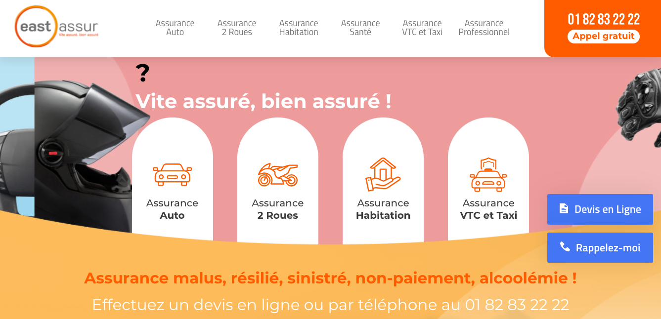 East Assur commercialise des solutions d’assurances dans les domaines de l’auto, des deux-roues, de l’habitation, de la santé, de l’assurance professionnelle (taxis et VTC compris) partout en France.