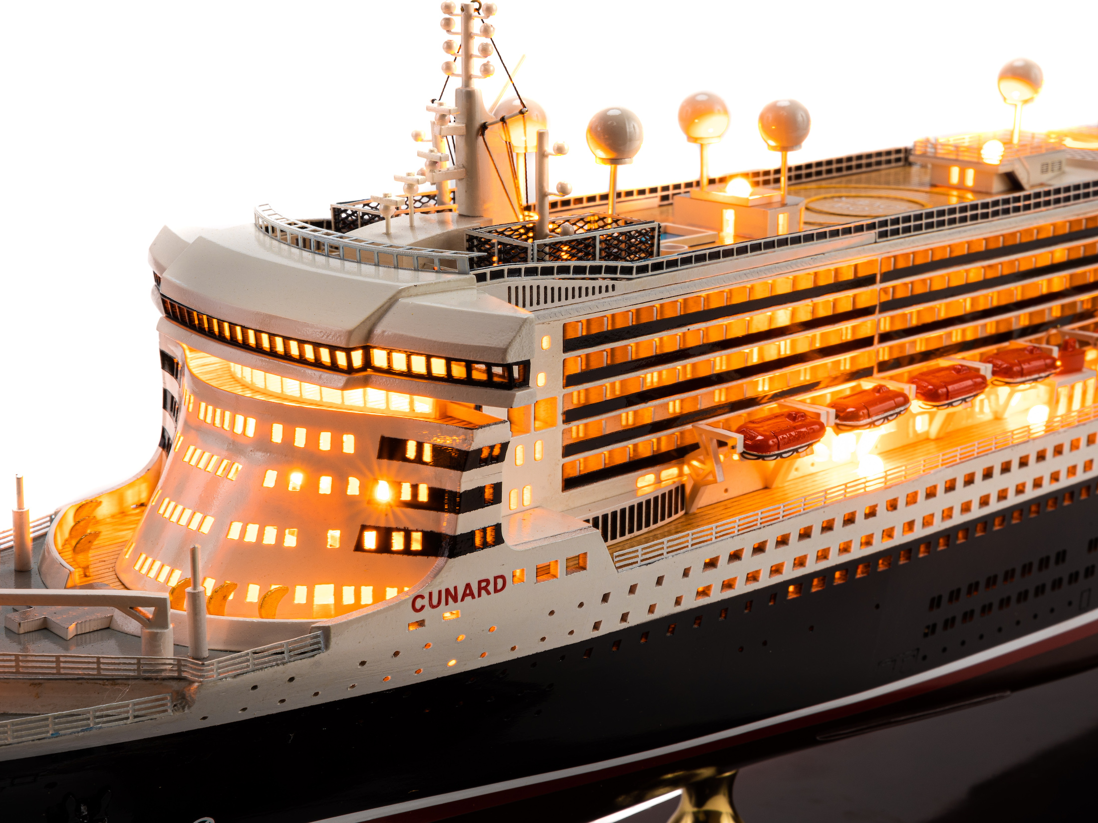 Cette maquette traduit avec précision le charme du dernier paquebot transatlantique, un navire britannique qui perpétue la tradition de luxe et de prestige de ses prédécesseurs. Elle a pour particularité d’être dotée d’un éclairage constitué de nombreux LEDs intégrées à l’intérieur de la coque, qui permettent de simuler une navigation de nuit. Prix : 1129 euros.