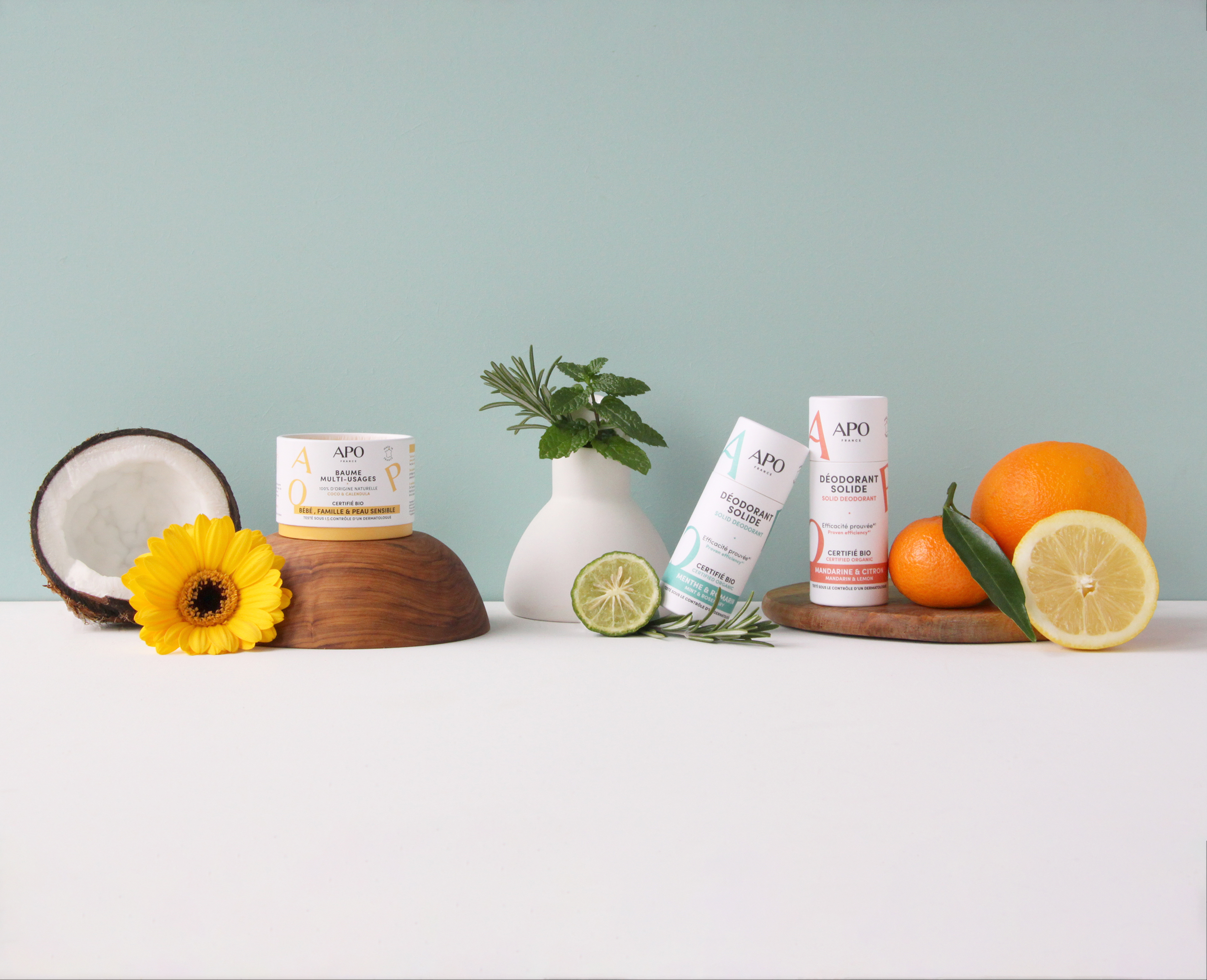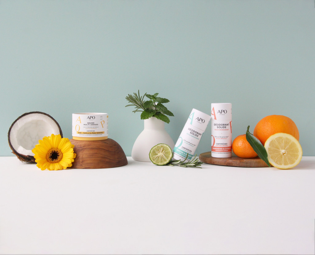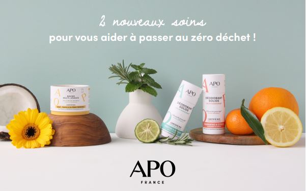 Aujourd’hui, APO lance deux nouveaux soins pour le corps : le baume multi-usages et le déodorant solide en stick, tous deux certifiés biologiques. De quoi permettre aux familles de bannir définitivement les emballages plastiques tout en profitant de soins efficaces et bons pour la peau !