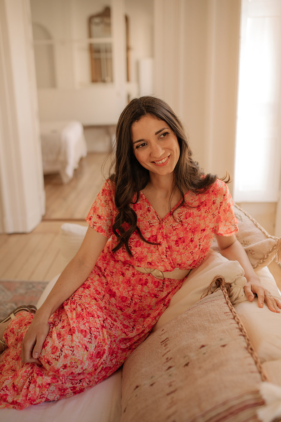 La robe Kara met à l’honneur un imprimé d’inspiration florale vintage aux couleurs chaudes. Ses manches trois-quarts se terminent par une jolie finition froncée, et le volant au bas de la robe lui donne une touche de légèreté et de féminité. Sa coupe ample et son tissu froncé subliment les corps d’après grossesse.