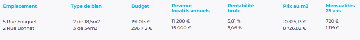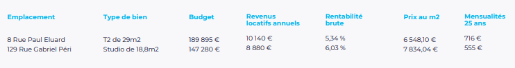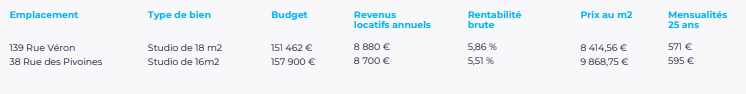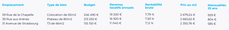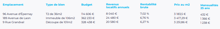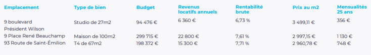 Les rentabilités brutes énoncées ci-dessous comprennent tous les postes de dépenses.
