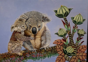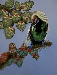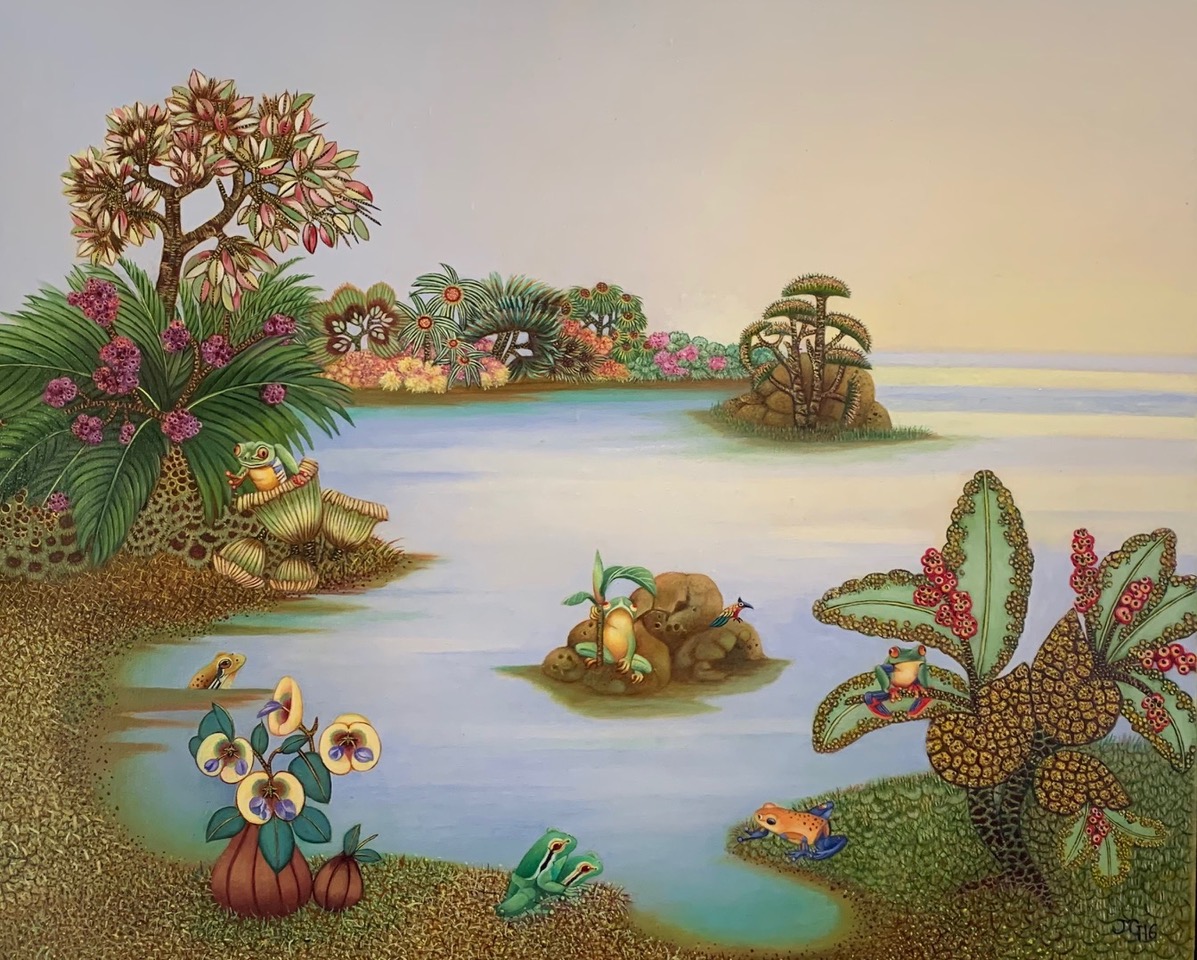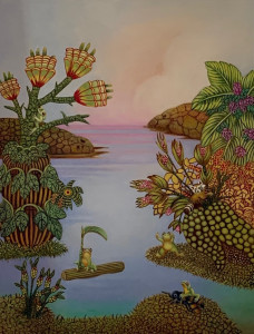 Elle nous offre un univers rêvé, dont la représentation repose sur un dessin élaboré et une peinture d’une extrême précision, un travail minutieux et subtil sur la couleur, avec des dégradés de bleus et de vert à la Douanier Rousseau, d’où surgissent des éclats d’ocres et de rosés. Invitation à un voyage, à une méditation sur l’harmonie d’un monde antérieur à la présence humaine.