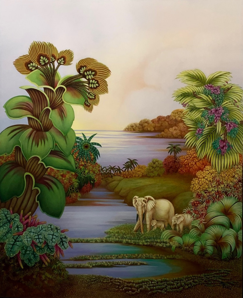 Comme un fil d’Ariane, cette peinture vivante et vibrante réveille le regard, appelle au côtoiement avec un bestiaire extraordinairement expressif d’oiseaux, de papillons, de grenouilles, de singes ou d’éléphants, mis en scène et en interaction ludique et facétieuse, en résonance avec une flore flamboyante.