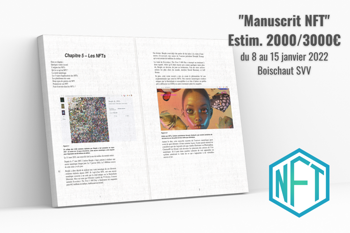 La société de ventes volontaires (SVV) Boischaut organise à Paris le 15 janvier 2022 la première vente aux enchères d’un fichier d’auteur avec certificat NFT, du Best-Seller « Bitcoin et les cryptomonnaies », de Daniel Ichbiah et Jean-Martial Lefranc, publié aux Éditions First, dans la collection Pour les nuls.