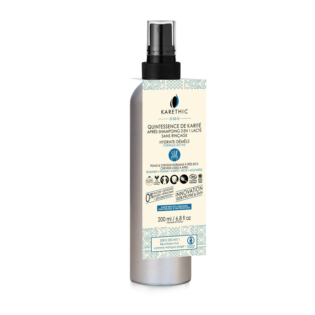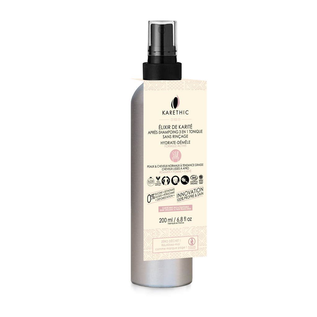 Elixir, quant à lui, est la fois un soin coiffant pour cheveux et une lotion tonique pour le visage. Utilisé en après-shampoing, Elixir de karité parfait le rinçage, rééquilibre le PH du cuir chevelu et fortifie les cheveux en refermant les écailles. Ses principes actifs présents dans l’hydrolat de romarin, le vinaigre de pomme bio et le karité brut apportent douceur aux cheveux. La peau et le cuir chevelu sont apaisés et purifiés.