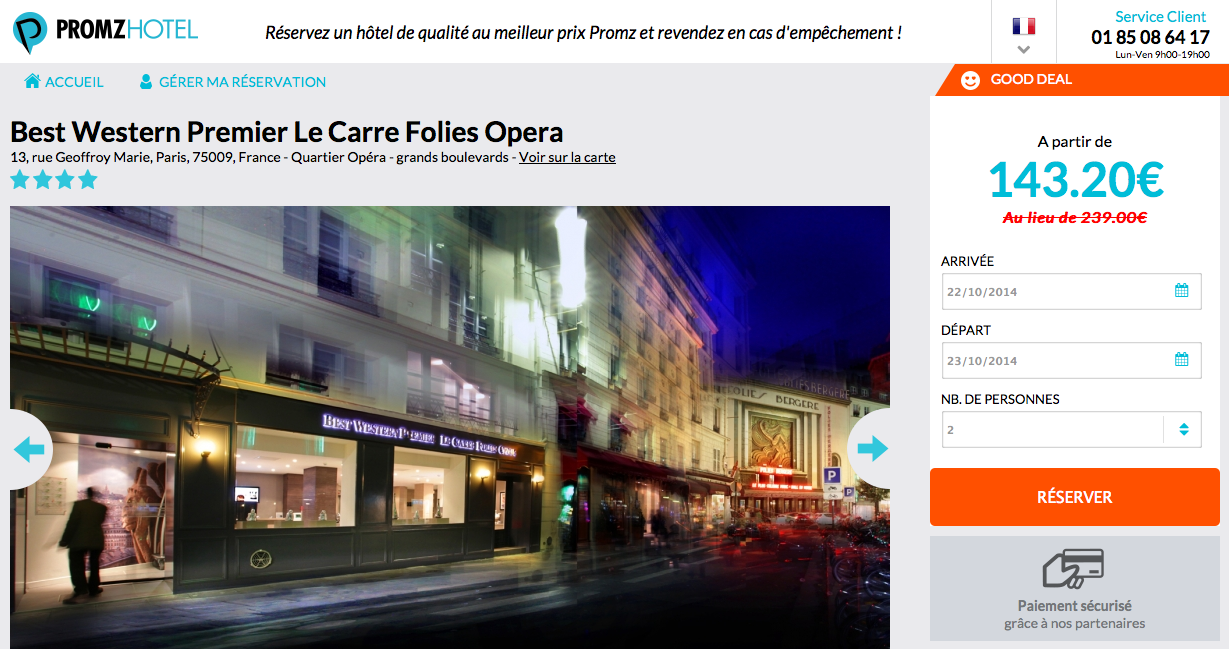 PromzHotel sélectionne selon de rigoureux critères qualitatifs des hôtels 3, 4, 5 étoiles et de charme en France et en Europe afin de commercialiser uniquement des offres promotionnelles non annulables et non remboursables, tout en permettant au client de revendre sa réservation en cas d’empêchement (sans conséquence financière pour l’hôtel, une notification de changement de nom suffit).