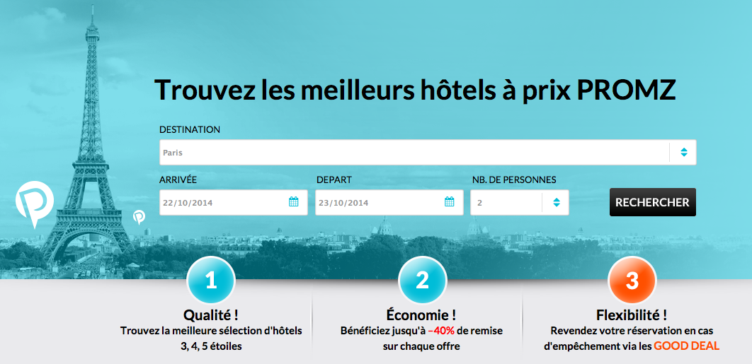 Une équipe de professionnels de l’hôtellerie, yield managers entre autres, et d’acteurs du marketing digital et de la communication créent PromzHotel, le 1er site de réservation d’hôtels commercialisant uniquement des offres promotionnelles non annulables et non remboursables tout en permettant au client de revendre sa réservation en cas d’empêchement… Un service inédit qui fait souffler un vent de fraîcheur sur l’hôtellerie en ligne !