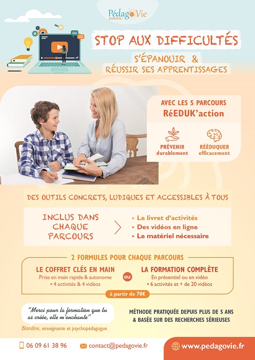 Christelle, maman (France) : “Les vidéos sont très complètes. Les explications sont claires et les exercices peuvent, avec une pratique sérieuse, s’intégrer facilement. La liberté de suivre la progression du parcours à son rythme est pour moi très appréciable et M. Bousquet est réactif pour répondre aux questions qui peuvent apparaître lors de l’apprentissage des outils, seul devant la vidéo !”