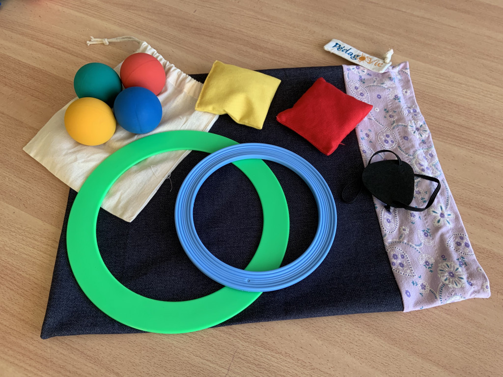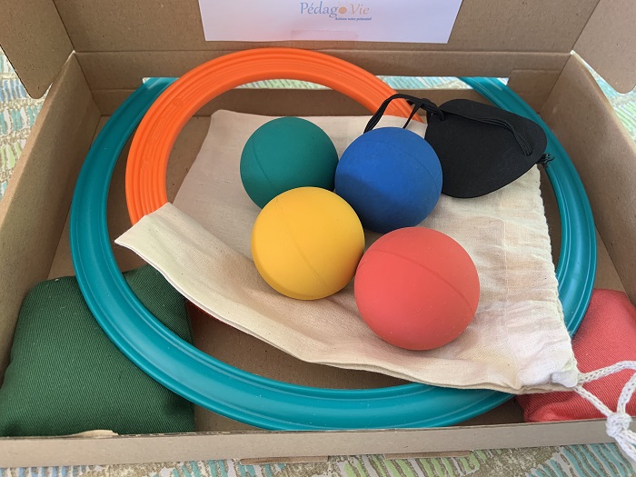 Le coffret de base contient ainsi : 4 balles en caoutchouc naturel, 2 sacs de sable faits mains et réalisés en France, 2 cerceaux et un cache-œil, ainsi qu’un joli pochon en tissu fait main en France par une talentueuse couturière afin de ranger les sacs et les balles.