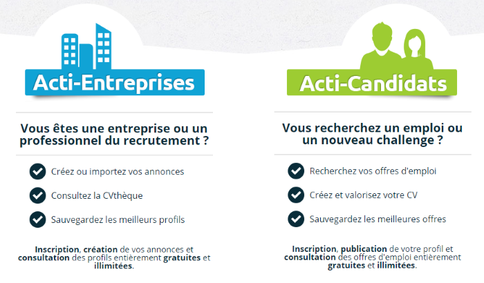 Côté entreprise : dépôt d’annonce gratuit et illimité dans le temps. Accès libre à la CVthèque anonyme. Outils de création d’annonce en ligne et possibilité d’importer une annonce provenant d’un document existant. Possibilité de constituer une CVthèque personnalisée. Utilisation de notre concept de “Crédit CV”, correspondant à la levée d’identité d’un profil et valable pour une durée d’une année. Mise à jour de la candidature pour tenir informé le candidat.