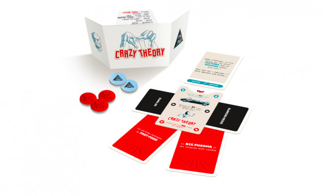 Crazy Theory est un jeu pour adultes fun (conseillé à partir de 14 ans), qui crée un pont entre les arts de la bande dessinée et du jeu, pour inviter les joueurs à porter un regard libre et décalé sur des univers “intellos” : ceux de l’éducation, de l’information, de la communication, de la politique et de la rhétorique.