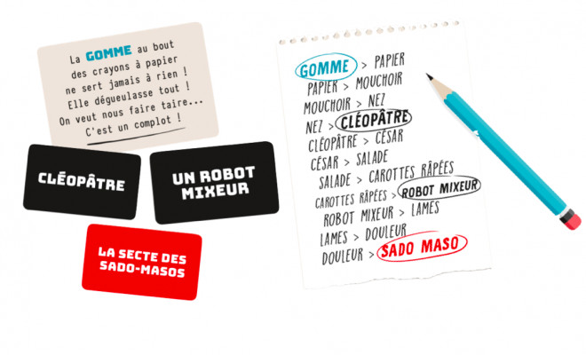 Crazy Theory, un jeu simple ; il n’y a pas d’arguments à développer pour démonter un complot, juste des mots à enchaîner, parce qu’un premier mot fait penser au suivant, qui fait penser au suivant, etc.