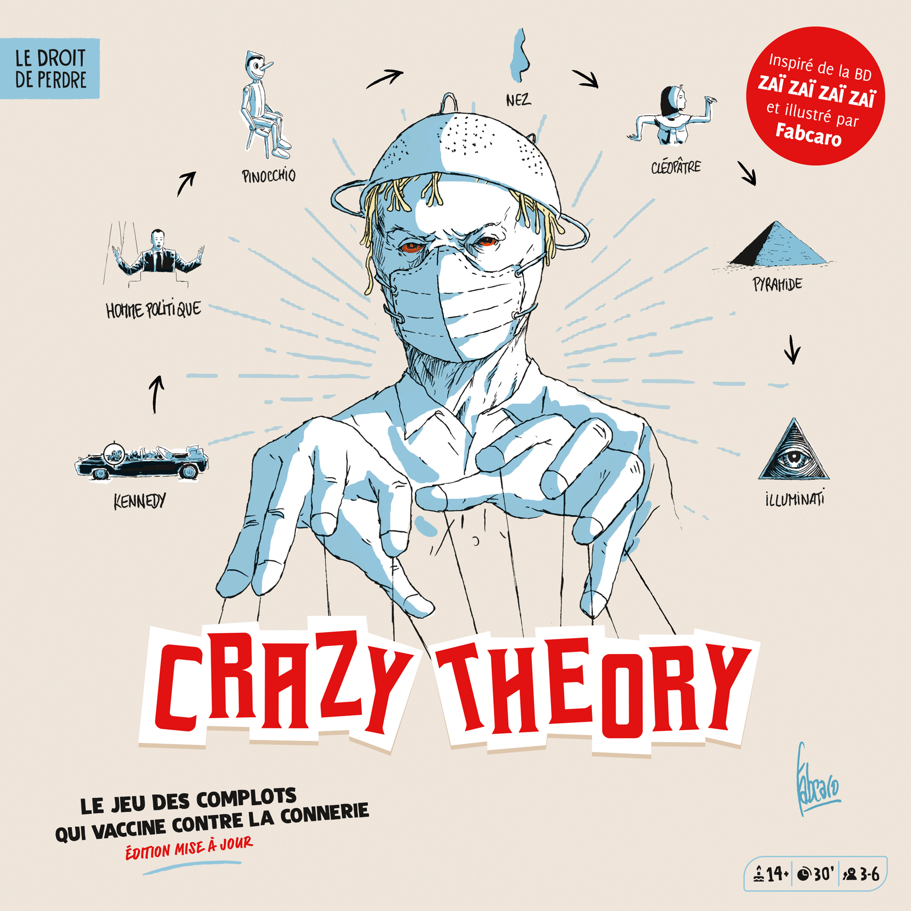À l’occasion de la sortie le 23 février du film Zaï Zaï Zaï Zaï de François Desagnat et avec Jean-Paul Rouve en premier rôle, le jeu de société Crazy Theory illustré par Fabcaro et inspiré d’une scène dans sa BD culte paraît dans une version remise au goût du jour. Crazy Theory est jeu de société créé par Christian Rubiella et Fabrice Andrivon, aux Éditions Le Droit de Perdre.
