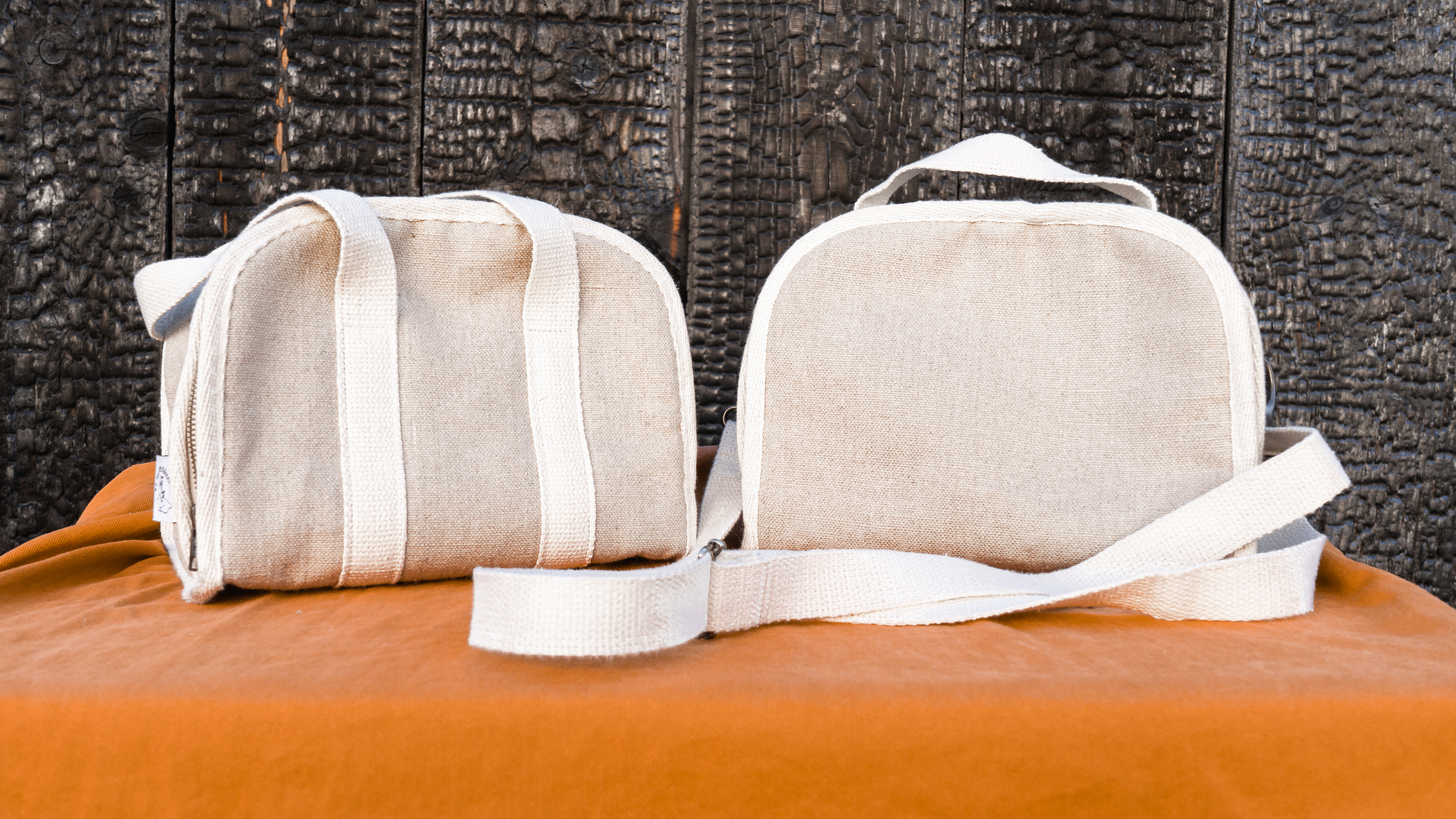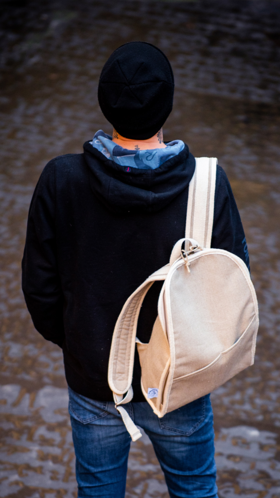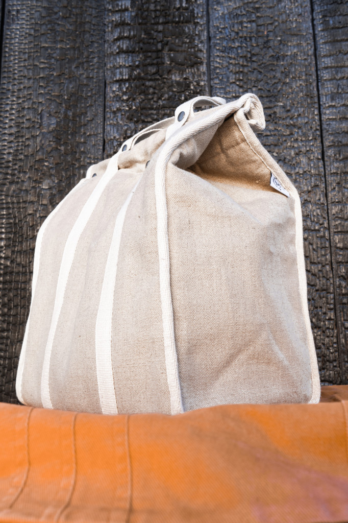 - Côté face : le chanvre et le lin. L’extérieur des sacs est couvert de toile de lin, une matière naturelle peu gourmande en eau. Les sangles et les biais sont faits de chanvre, une plante particulièrement écologique et résistante : sa culture ne nécessite peu d’eau et aucun engrais ni pesticide, et chaque hectare de chanvre absorbe 15 000 tonnes de CO2.