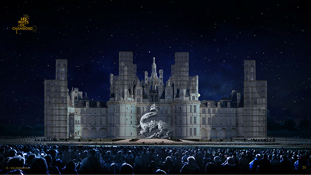 Le Château de Chambord, avec son rayonnement international, est incontestablement le premier atout du spectacle. Ses 156 mètres de façade seront mis en lumière avec 18 vidéoprojecteurs 4K grâce à l’implication de l’équipe de Masters & Events Factory composée de 12 personnes spécialisées dans la scénographie, les recherches historiques, l’écriture, la production musicale, la production des images, le design lumière, le design pyrotechnique…