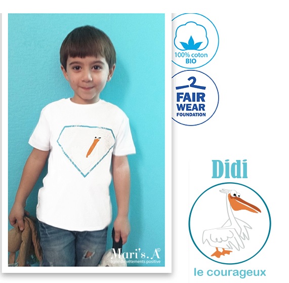 - Didi le pélican (gamme garçon), ambassadeur de la protection de l’air : 1 polo, 1 marcel et 1 tee-shirt ;