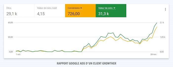 Growther peut configurer une Campagne Google Ads de A à Z afin de valoriser chaque entreprise sur le moteur de recherche le plus utilisé par les internautes :