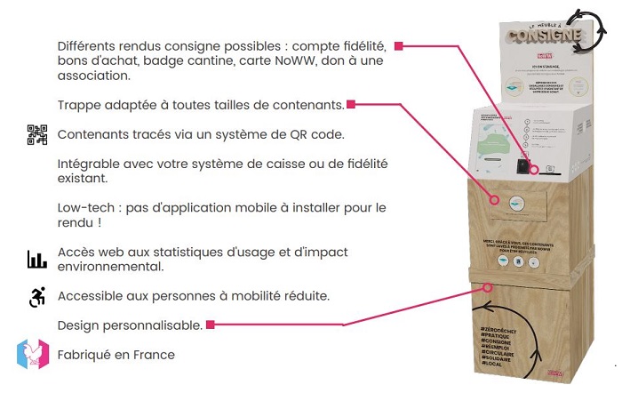 Les Machines à Consigne, conçues et fabriquées en France, permettent de récupérer les contenants après usage. Ils rendent l’argent de la consigne aux clients, tout en analysant les impacts environnementaux et en créant de la fidélité !