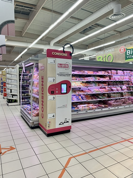 - Il rapporte son contenant après usage et l’insère dans la Machine à Consigne NoWW installée dans le magasin.