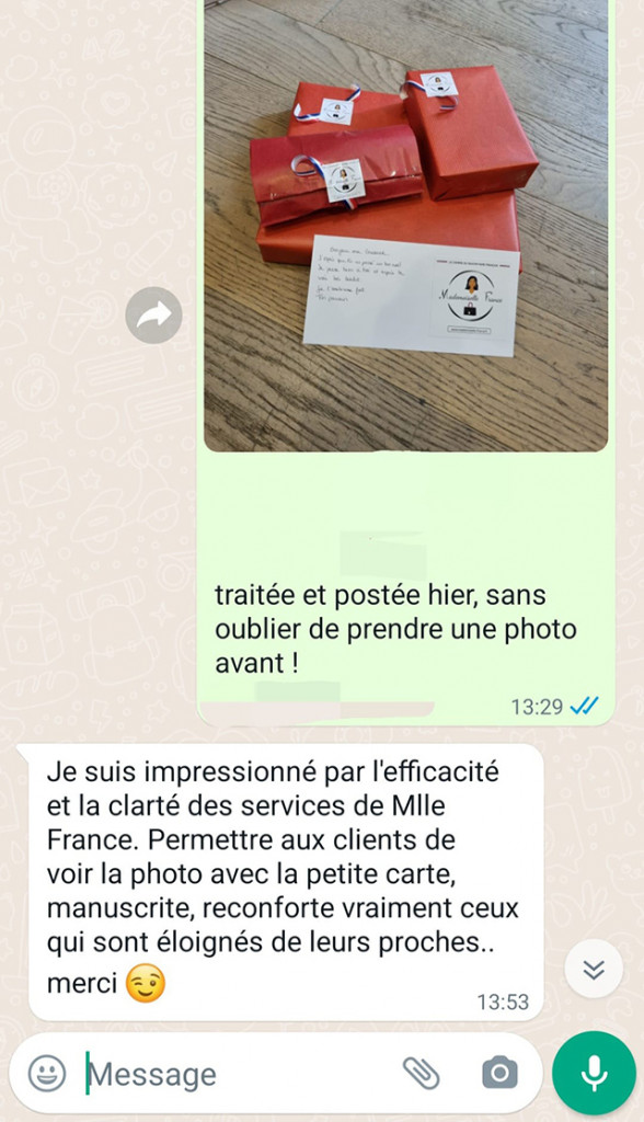 De plus, un lien de proximité se crée entre la boutique et l’acheteur : juste avant l’envoi, une photo du ou des cadeaux emballés et du petit mot est envoyée à l’acheteur afin qu’il ait le rendu final.