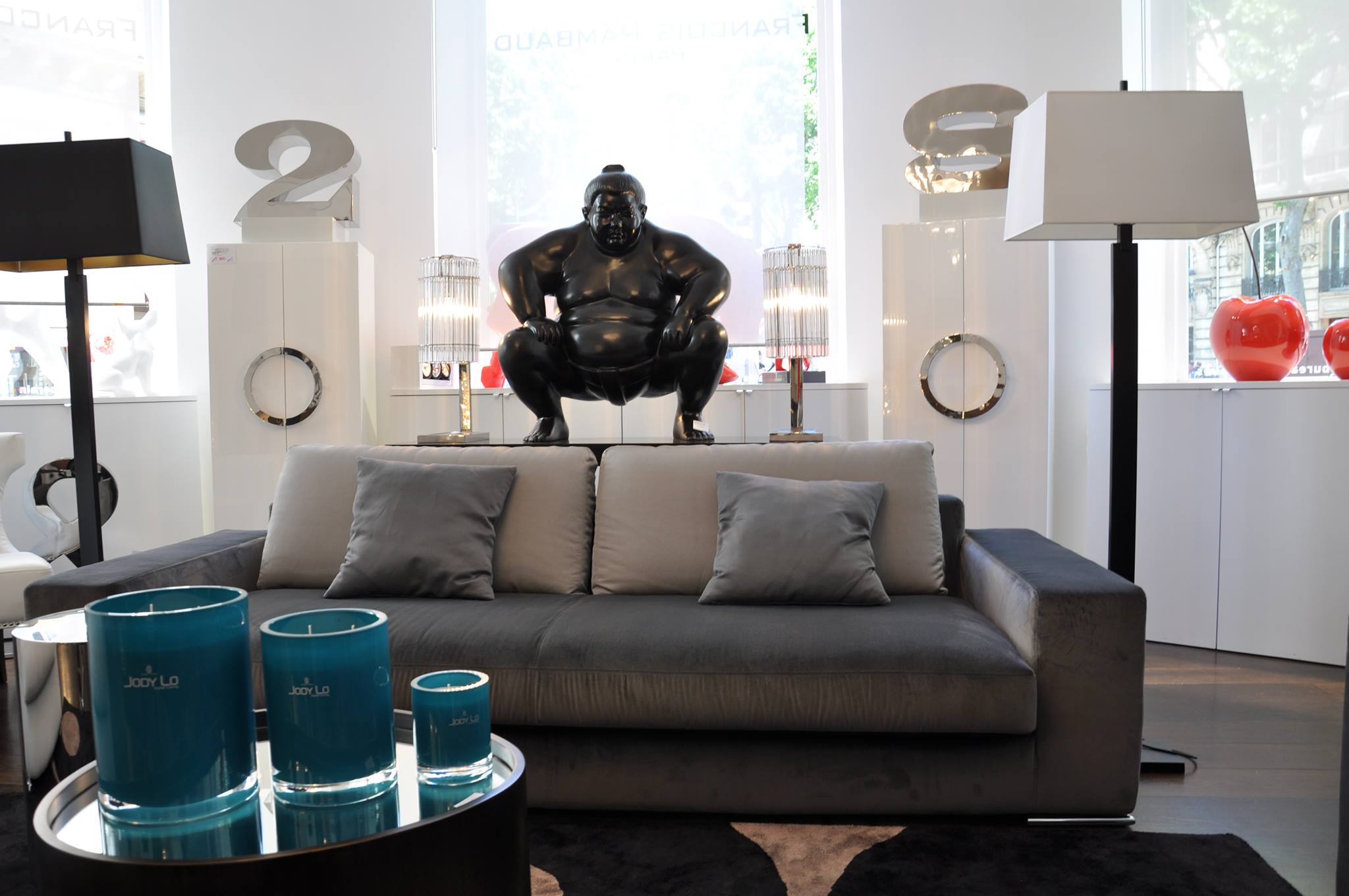 Autre astuce : associer plusieurs petits formats identiques mais dans des coloris différents. Ou mettre sur une commode une série d’objets design telles que les 3 petits singes sagesse (hauteur totale : 28 cm – tarif : 550 €) ou encore , oser le grand sumo sur une console (hauteur 85 cm, 2 200 euros) ou le rhinocéros sur une terrasse ou dans un jardin.