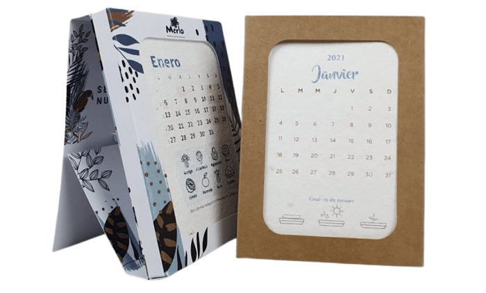 Plusieurs graines au choix vont ensemencer les feuilles du calendrier : tomate (janvier, février et mars), carotte (avril, mai et juin), camomille (juillet, août et septembre), célosie (octobre, novembre et décembre).