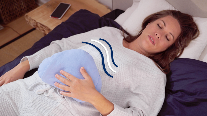 Il suffit d’une petite tape pour allumer le coussin de relaxation. Posé contre le ventre, il va analyser la respiration pour comprendre l’état émotionnel et s’adapter automatiquement aux besoins du moment.