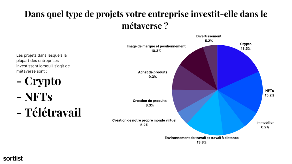 - Les trois projets dans lesquels les marques investissent le plus sont : la crypto (18%), les NFTs (15%) et le travail à distance (14%).