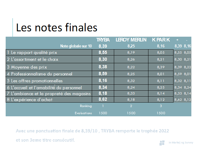 L’enseigne Tryba est de nouveau élue par les consommateurs français avec une ponctuation finale de 8,39/10, devant Leroy Merlin et K par K.