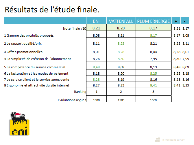 Avec une note finale de 8,21/10, Eni remporte son 5eme titre consécutif. Vattenfall et Plüm énergie complètent le podium.