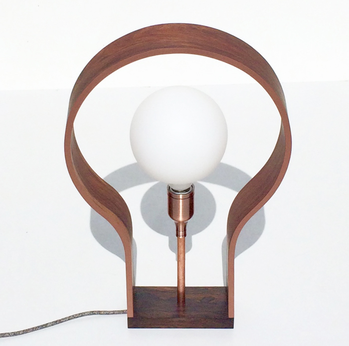 Design et minimaliste, cette lampe joue avec la silhouette de l’ampoule, taillée dans du palissandre Dos Santos, un bois aux tons ambrés et chauds. Elle mesure 60 cm de hauteur.