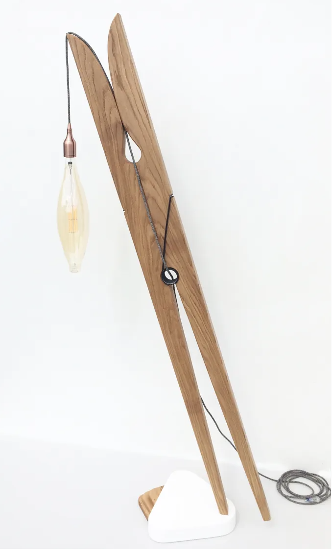 Ce lampadaire design et contemporain prend la forme d’une pince à linge XXL en chêne massif. Il est fixé sur une base composée d’un assemblage de bois, de métal, de béton et de résine.