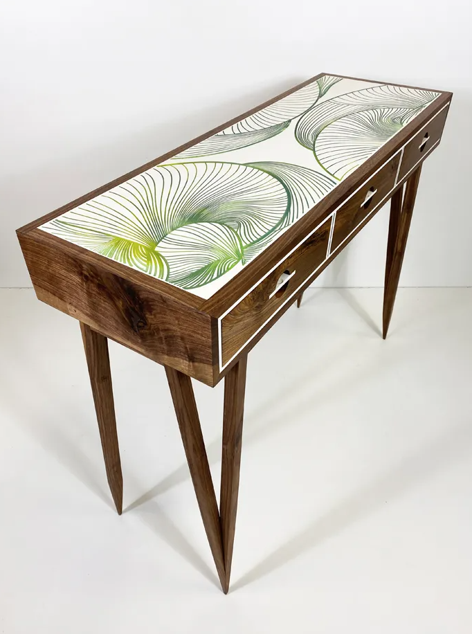 Cette console est le résultat d’un accident : initialement conçue en corian, un matériau synthétique dur mais fragile, elle est malencontreusement tombée sur le côté et un de ses angles a éclaté, la rendant irréparable. L’ébéniste a décidé d’intégrer le plateau de table dans un cadre en noyer, qui contraste avec le blanc spectaculaire du corian. La table est dotée de trois tiroirs et de pieds originaux, qui se terminent par une section très fine.