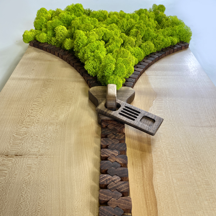 Ce tableau en bois raconte une page de l’histoire de Sébastien Dubreuil. Il est un clin d’œil à une réalité cachée, différente de celle qui nous est imposée. Le fond du tableau est réalisé en érable, la fermeture éclair en hêtre et en noyer, et la partie végétale en lichen stabilisé.