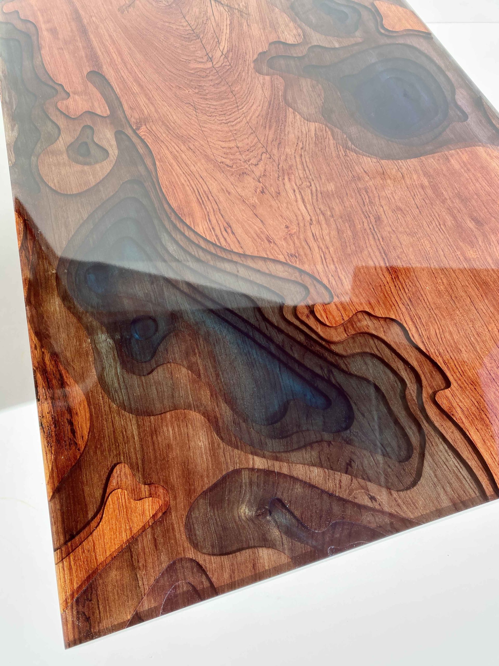 Cette table basse a été réalisée avec un seul morceau de bois, un plateau de buginga, un bois d’Afrique centrale aux reflets rouge orangé. Sébastien y a sculpté différents étages pour suivre les lignes du bois dans l’épaisseur du plateau, avant d’y couler de la résine époxy légèrement teintée, créant ainsi un véritable tableau topographique.