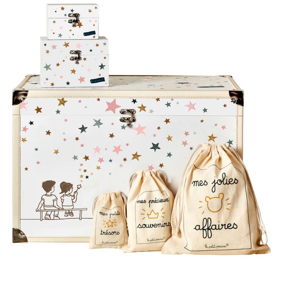Les bébéothèques sont de belles malles en bois, inspirées par la nature pour le modèle Esmée et par les étoiles, qui évoquent la magie de l’enfance, pour le modèle Célestine. Elles permettent de réunir tous les plus précieux souvenirs d’enfance. Chaque bébéothèque réunit également deux coffrets et trois pochons en coton, et peut être personnalisée avec le prénom de l’enfant.