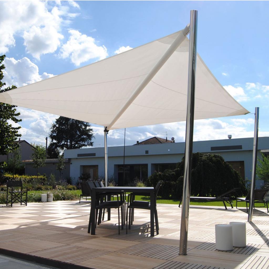- Des mats en inox pour voile d’ombrage avec platine, à sceller ou amovible avec fourreau ;