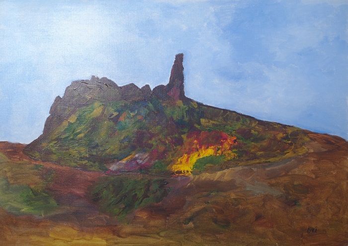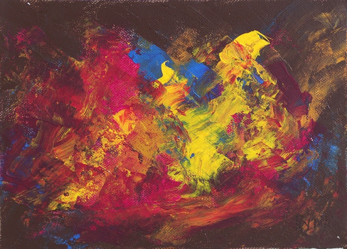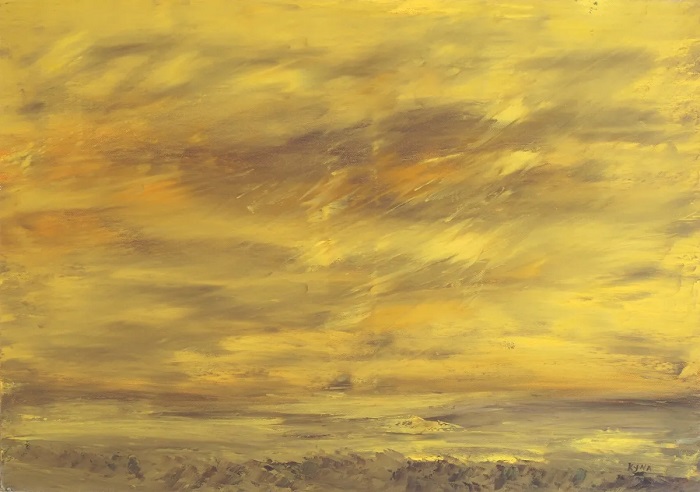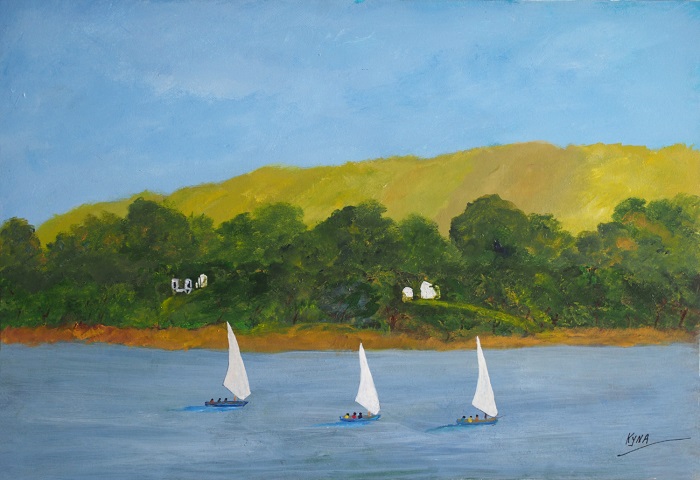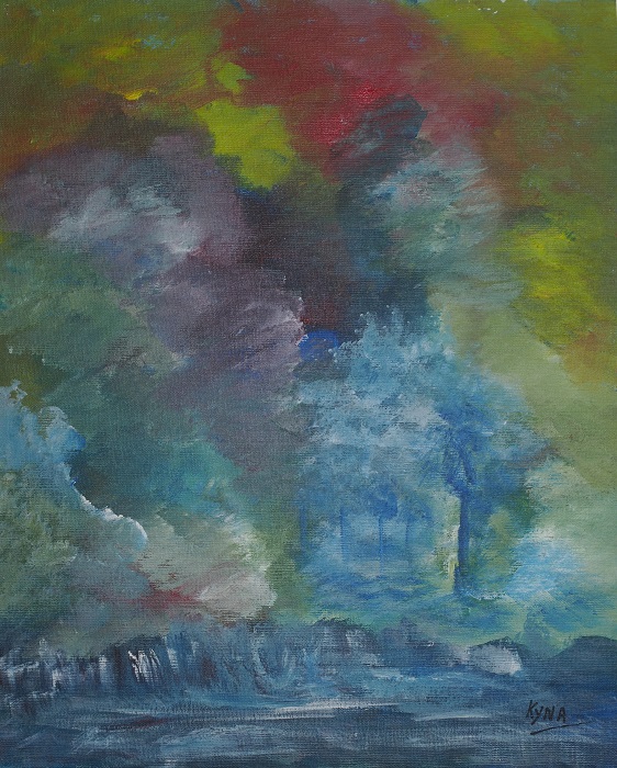 Son amour des scènes étranges, oriente l’artiste vers des compositions de visionnaire, très loin de la réalité, car c’est une mystique, Kyna de Schouël. Son enthousiasme est guidé par son hypersensibilité et, elle rêve dans une palette originale et très symbolique. J’ajoute que c’est une œuvre prenante et à la limite de l’abstrait.