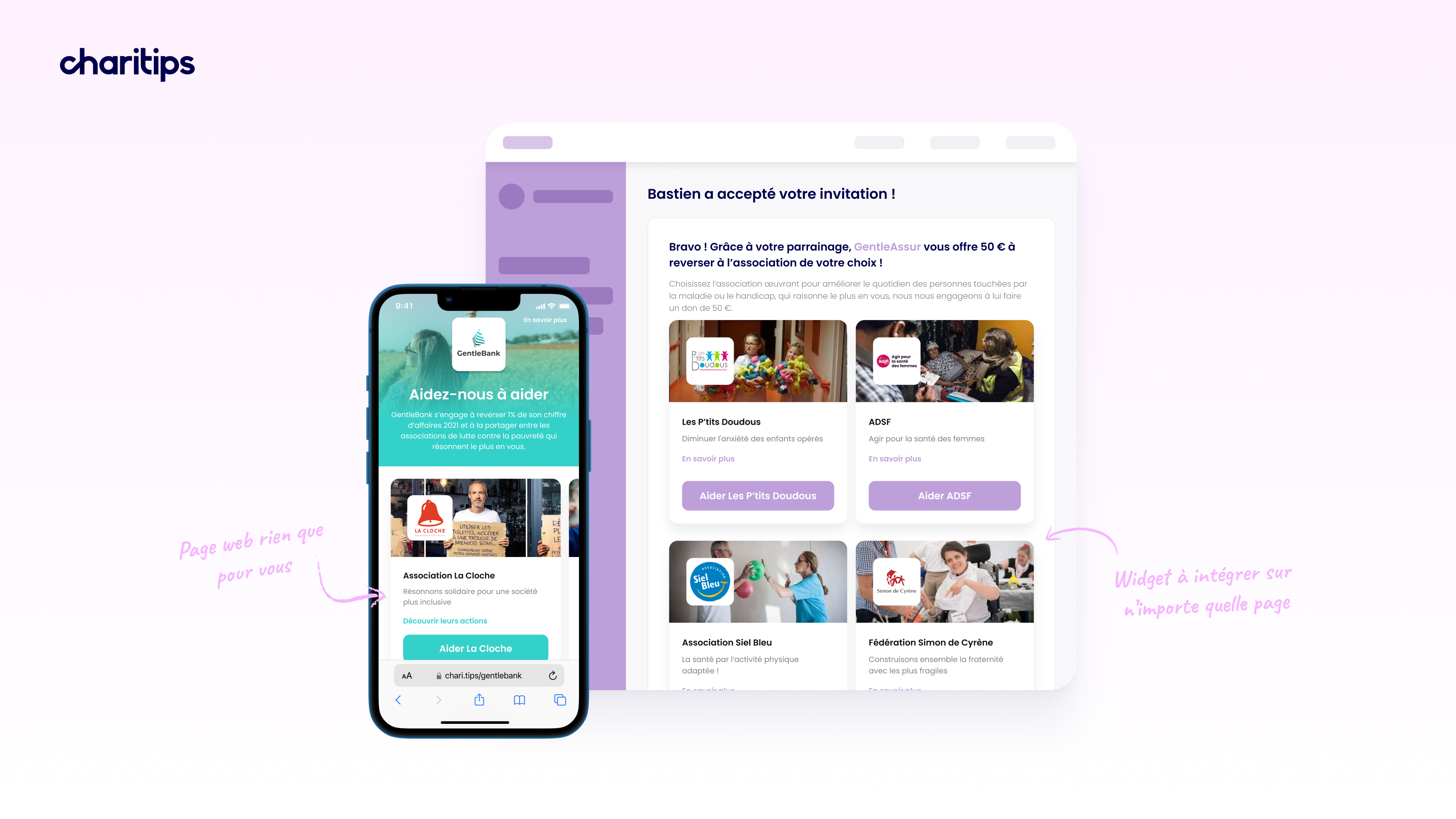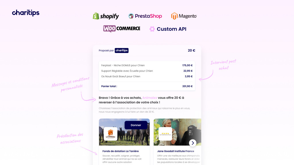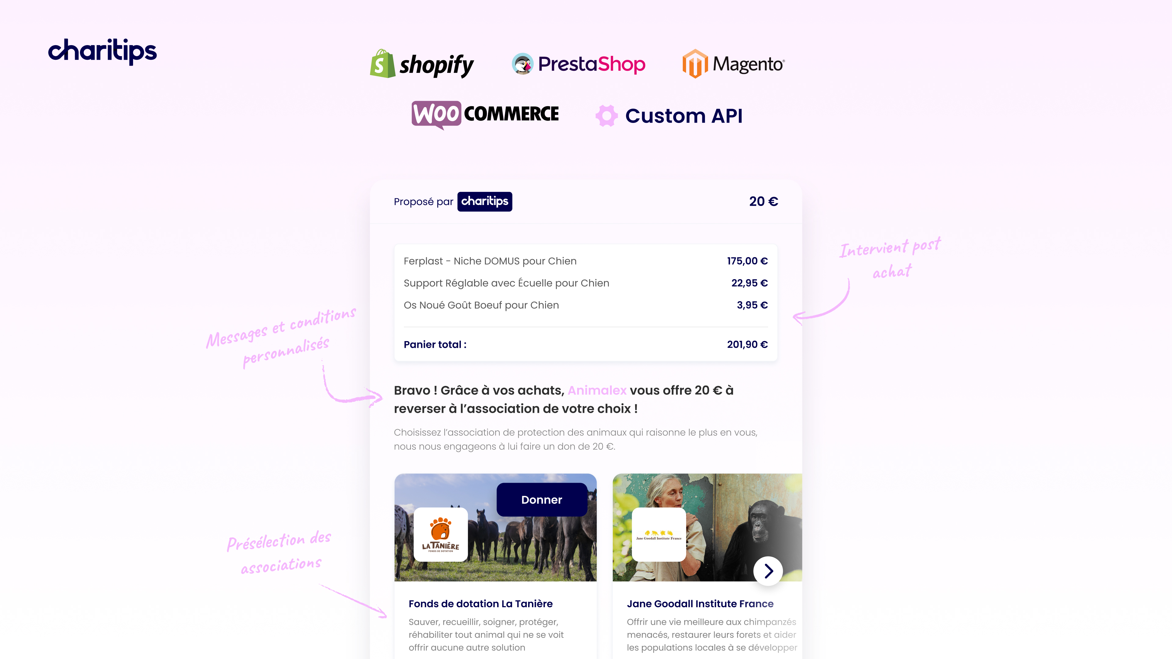 Notre approche est 100% orientée produit : Charitips s’intègre directement et simplement dans n’importe quel système technologique. Concrètement, cela signifie que pour l’utilisateur final, l’opération de don est simple, transparente et intuitive. Elle fait partie de son parcours d’achat ou d’utilisation.