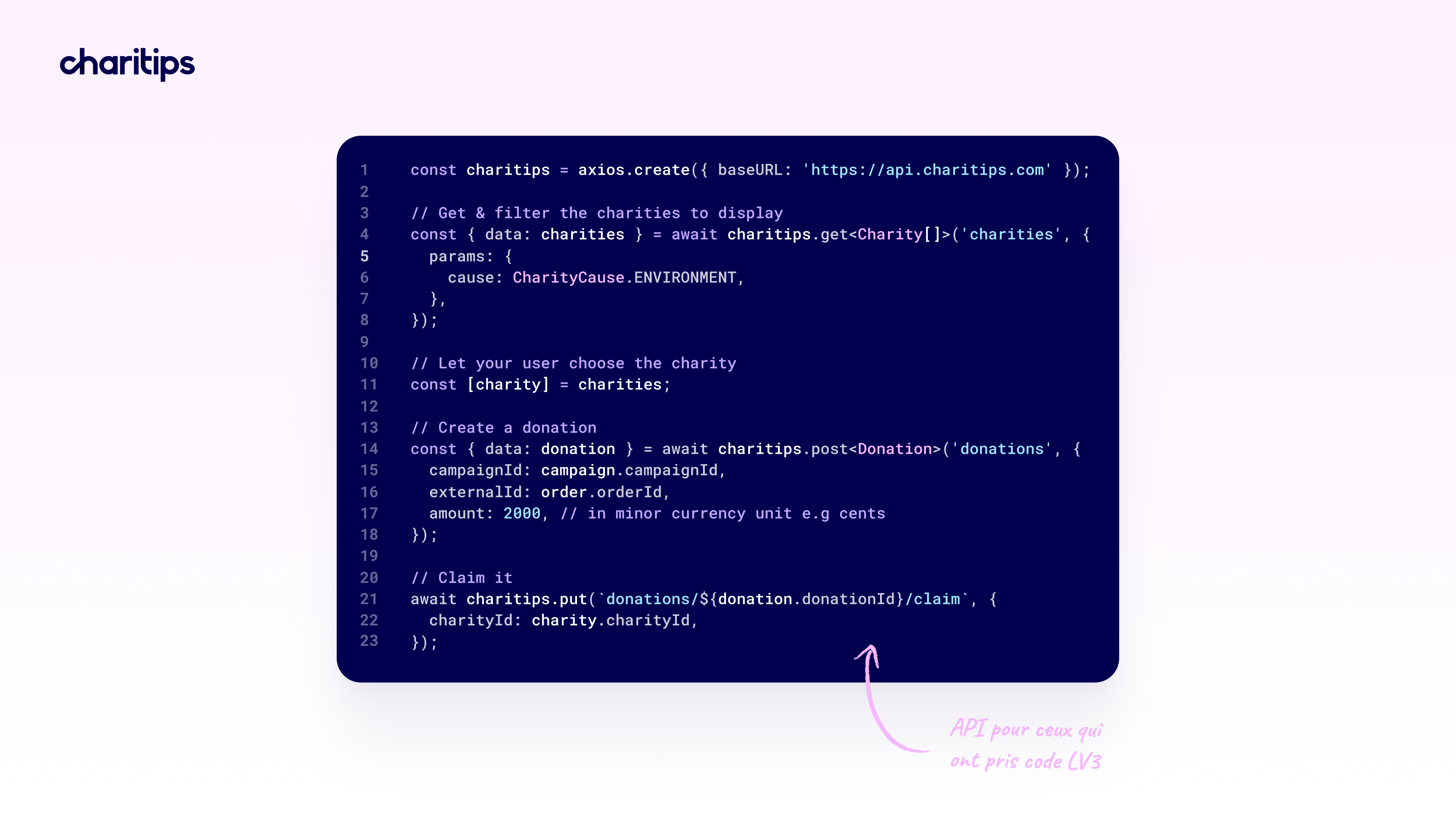 Une intégration personnalisée par API pour permettre aux développeurs d’intégrer les fonctionnalités de don à la proposition de valeur de leur produit. Charitips réalise également du développement sur mesure pour les demandes spéciales ou les grands comptes.