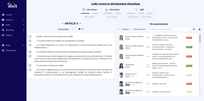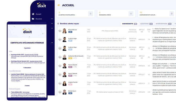 En prime, l’avancée de tous les dossiers législatifs peut être suivie en temps réel, via une interface unique. Dixit permet d’être alerté de toutes les étapes de la Construction de la Loi ainsi que du dépôt et du sort des amendements sur un texte ou un article d’intérêt en temps réel.