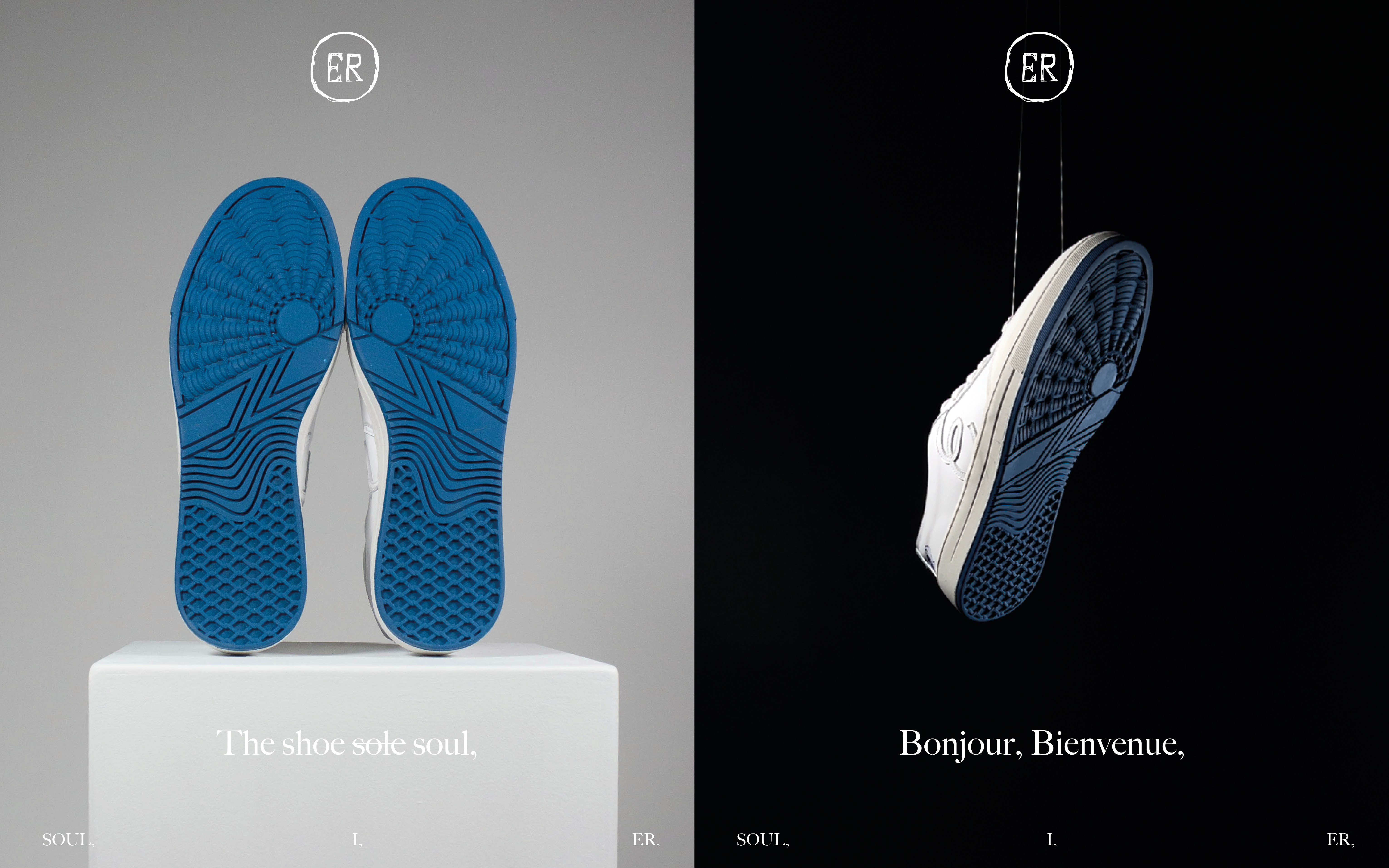 L’une de ses créations les plus visibles est le bleu saisissant, un pigment produit en interne, visible sur toutes les semelles comme élément de signature pour ER lors de son lancement.