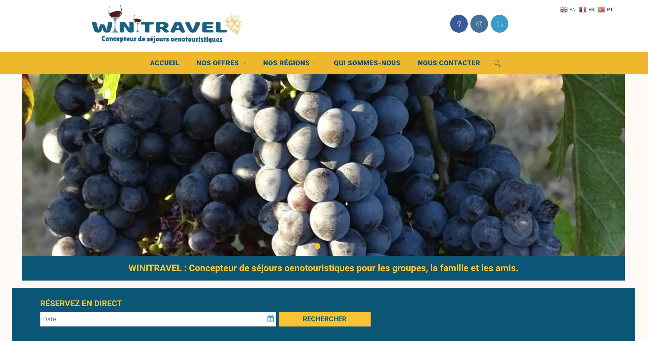 WiniTravel est une agence de voyage spécialisée dans l’organisation de séjours œnologiques. Elle a pour vocation de faire découvrir le vignoble français grâce à des offres tout compris, sous forme de journées et de séjours autour des vins de nos belles régions françaises. A ce jour, WiniTravel propose des offres dans le Bordelais, le Centre-Val de Loire, la Champagne, la Bourgogne, la Vallée du Rhône et le Languedoc-Roussillon.