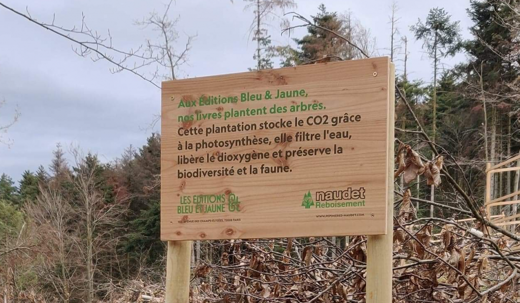 Chaque année, des arbres sont plantés grâce au financement des Editions Bleu et Jaune. Ces plantations permettent de stocker le CO2, de filtrer l’eau, de libérer le dioxygène et de préserver la biodiversité et la faune. En 2021, deux plantations ont eu lieu : en avril 2021, cent arbres ont été plantés en Alsace et, en décembre 2021, cent arbres ont été plantés dans le domaine de Chantilly (à proximité du château de Chantilly), géré par l’Office national des forêts.