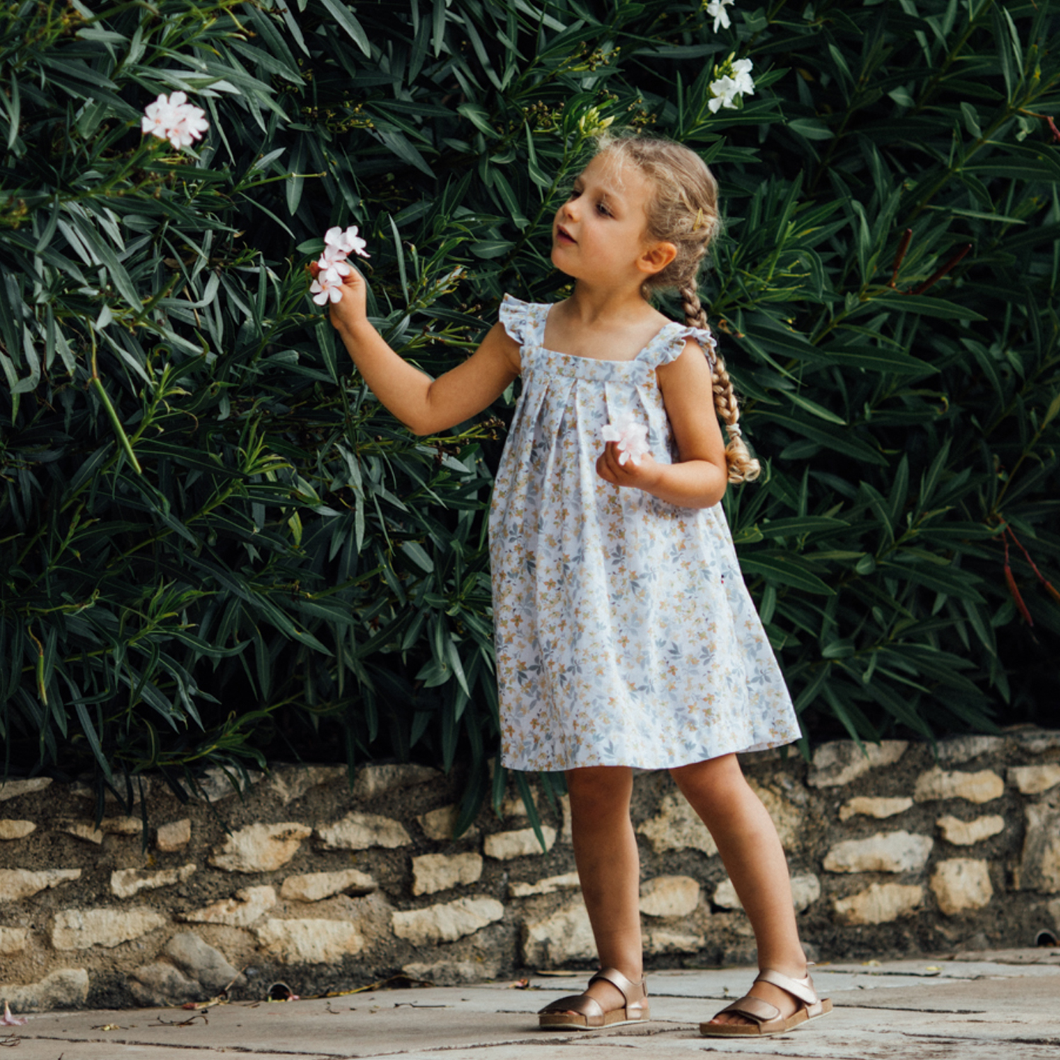 Cette robe à bretelles amovibles est taillée dans un voile de coton imprimé de fleurs jaunes. Ses froufrous sur les épaules lui confèrent un caractère chic qui ravira les petites filles.