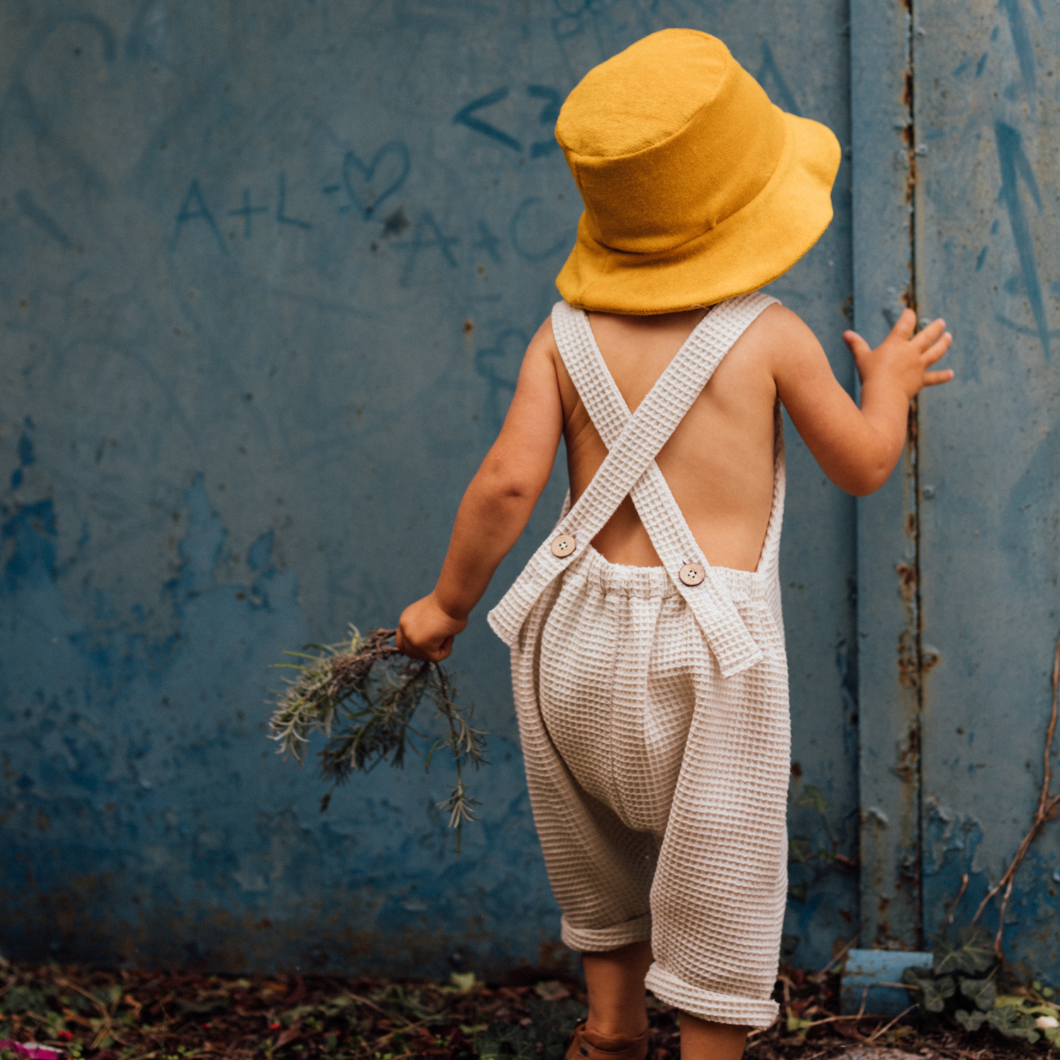 La collection « Dans les champs de colza » est composée de robes, bloomers, salopettes, tops, gigoteuses, bobs et sacs à dos pour les bébés et les enfants jusqu’à 6 ans. Lumineuse et fleurie, elle contraste la chaleur de la couleur jaune miel avec la douceur du lin naturel, du gris clair et du lait.
