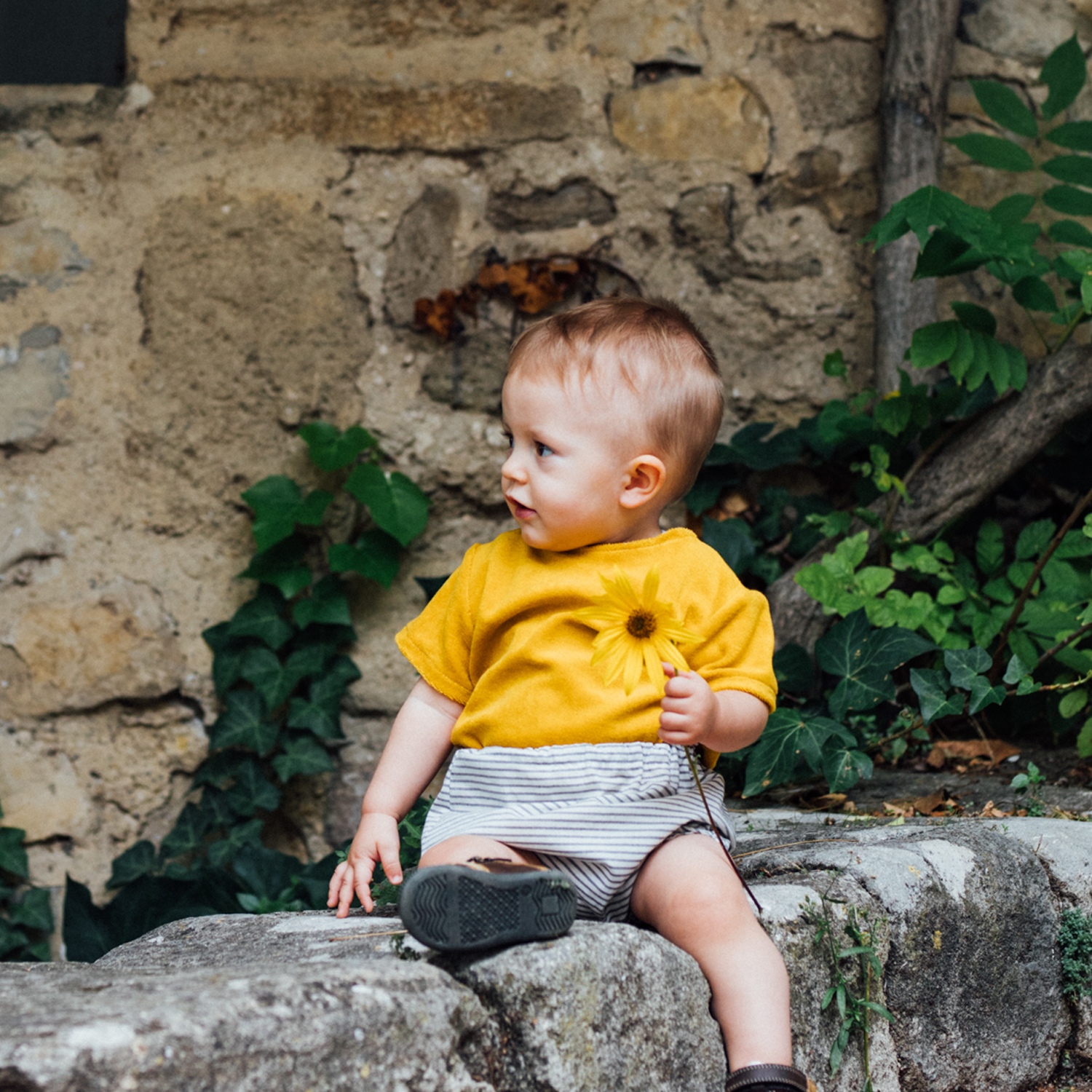Avec son tissu éponge couleur miel, ce t-shirt ensoleillé égaie le dressing de bébé. Le top s’ouvre entièrement dans le dos par des boutons pression doré.