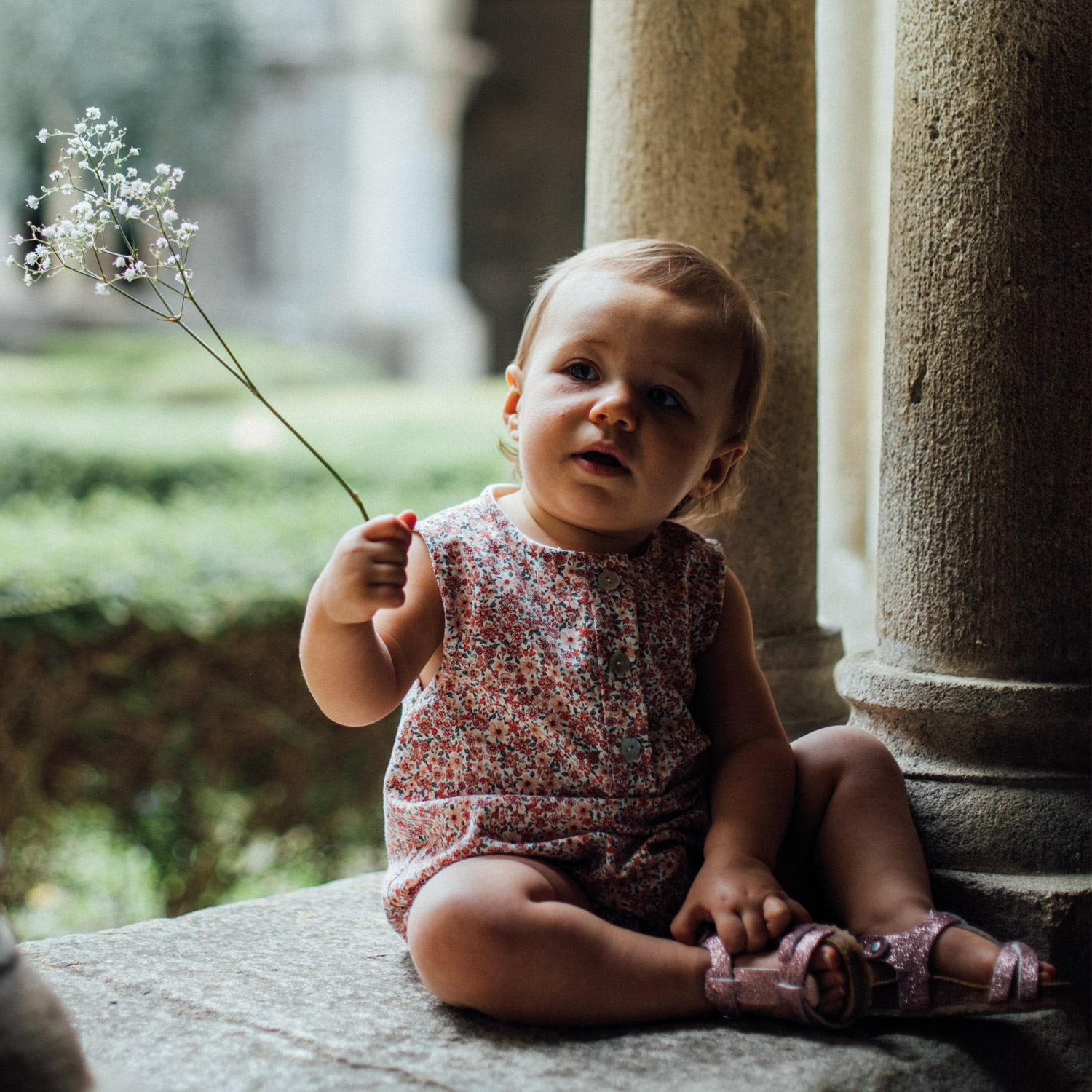 Cette petite barboteuse sans manches est confectionnée dans un joli imprimé fleuri rose. Elle s’ouvre sur le devant grâce à des boutons en nacre véritable.