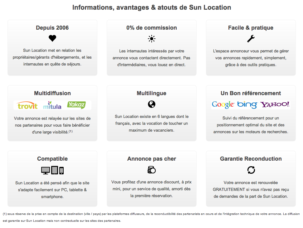 Afin de garantir un service de qualité tant pour les annonceurs que les particuliers à la recherche d’une location de vacances, et de limiter au maximum les risques de publication d’annonces frauduleuses, Sun Location a décidé en novembre dernier de fermer son service d’annonces gratuites tout en restant accessible à tous les professionnels et propriétaires.