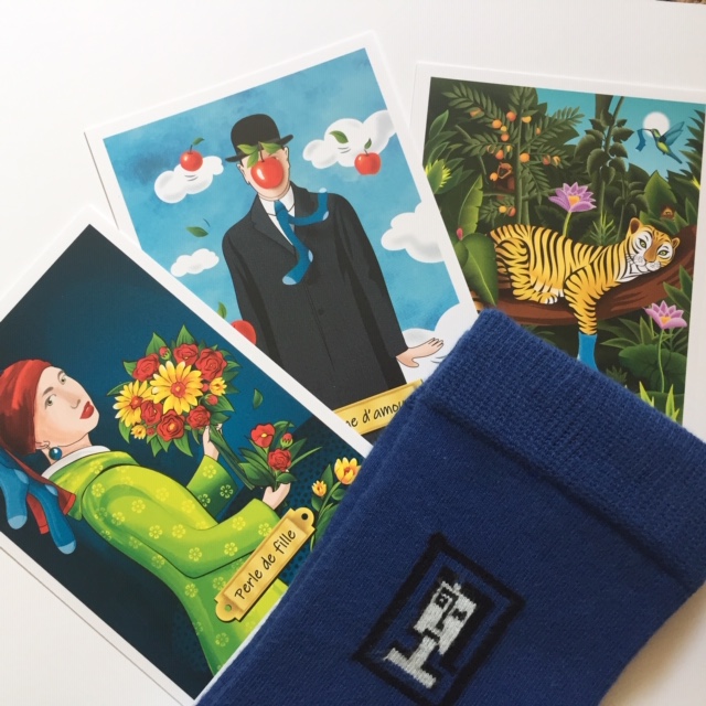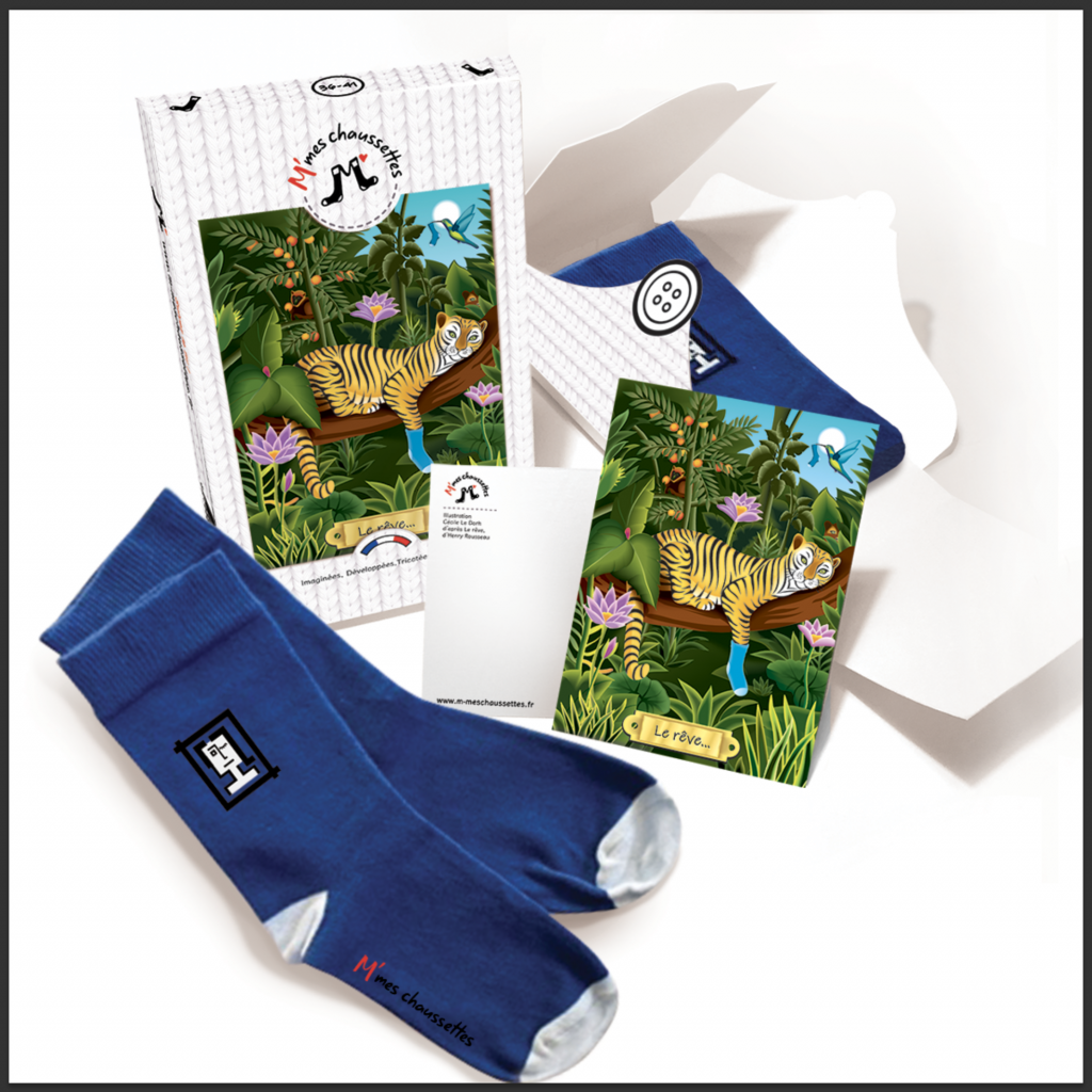 Le principe est simple : 3 couleurs de chaussettes sont proposées, chacune correspondant à une thématique. Emballées dans un étui cartonné au format “Livre de poche” (10 x 18 cm), elles sont accompagnées d’une carte postale illustrée et permettant la rédaction d’un petit mot.